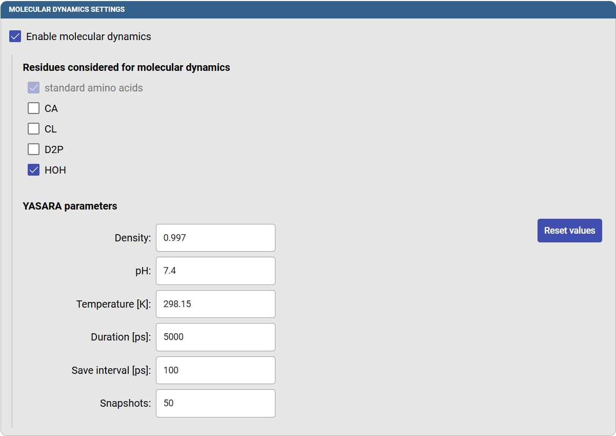 You can adjust the “YASARA parameters” that define some of the conditions in which the MD will be carried out. For example, you can modify the pH, temperature, MD duration, and the frequency to save the snapshots (which will affect the final number of snapshots that will be saved and analyzed). In this case, specify the temperature as 298.15 K (25.0 °C), a duration of 5000 ps (5 ns) and the save interval as 100 ps, so you will obtain 50 snapshots for the analysis.
