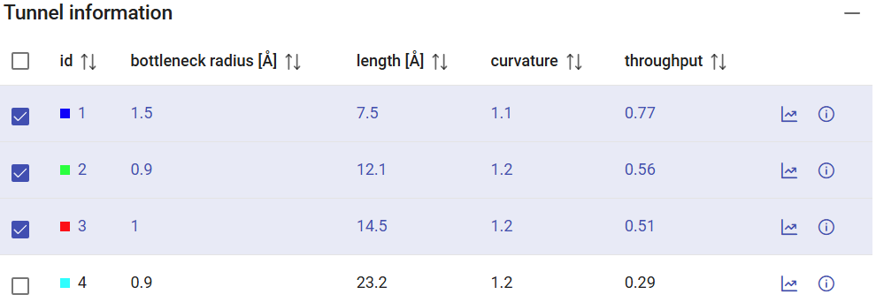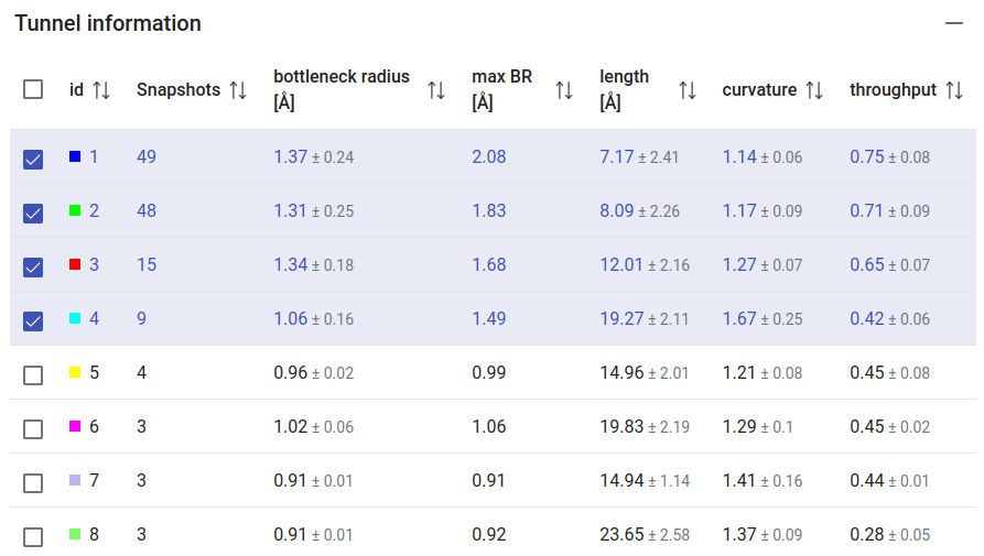 You will have an overview of the all the tunnels found and their statistics in the window “Tunnel information”. If no tunnels were found, you could try using a smaller probe size (Minimum probe radius) on the previous page. The Tunnel information panel shows the general properties of the tunnels, namely the bottleneck radius, the length of the tunnel, curvature and throughput. The checkboxes at the left-end of each tunnel allow you to display/undisplay the tunnel in the viewer down below.