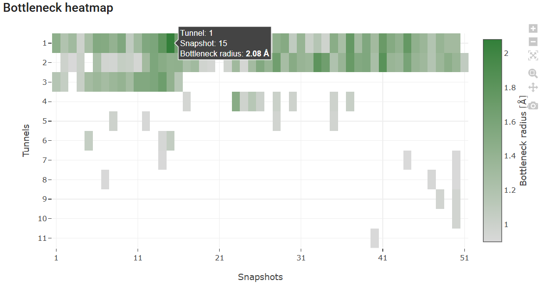 Below the “Tunnel information” is the “Bottleneck heatmap”. This map describes, for each tunnel, the bottleneck radius along the MD simulation by the color intensity. It allows easily assessing how frequently each tunnel was detected (according to the probe radius specified before), and how wide or narrow it was throughout the MD. If you hover your mouse on a particular tunnel and snapshot, you will see the bottleneck radius of the tunnel at that exact snapshot. In this case, we can easily identify that tunnel 1 was at its widest stage in snapshot 15, with a bottleneck radius of 2.08 Å. If you hover the mouse on the right end of the panel, hidden buttons appear, and you can zoom the heatmap in and out and download it as image file in png format.