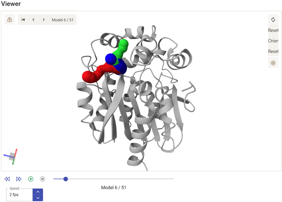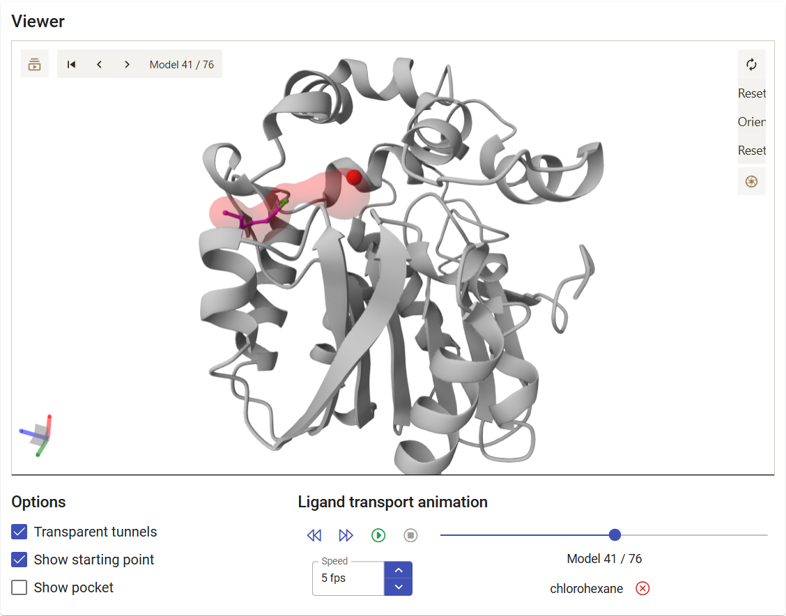 The viewer shows the motions of the protein backbone and the tunnels dynamics during the MD simulation. The tunnels selected in the panel above are displayed, and the user can analyze, for each snapshot, how their geometry and topology changed from snapshot to snapshot, and when they were detected. Under the viewer window are several buttons to stop/play the animation and move the snapshots back and forth, a slider that can be used to quickly move the MD back and forth to the desired snapshots, and a field to control the playback speed.