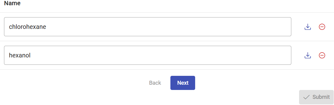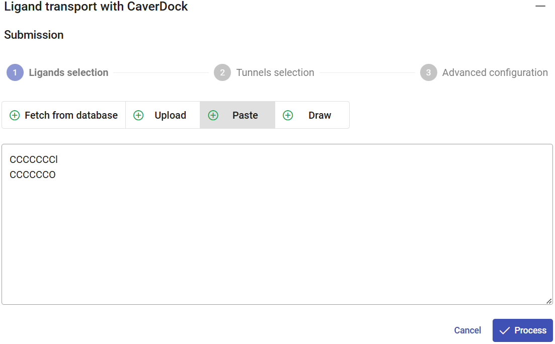 The SMILES for substrate 1-chlorohexane is CCCCCCCl. Click on the “Paste” pane, paste this code, and click on “Process”. You could add a list of multiple ligands with different codes, one per line, to run multiple CaverDock calculations in a single submission. You can rename every ligand to its chemical name or any acronym of your choice. Under the field “Name”, change the name from CCCCCCCl to “chlorohexane”.
