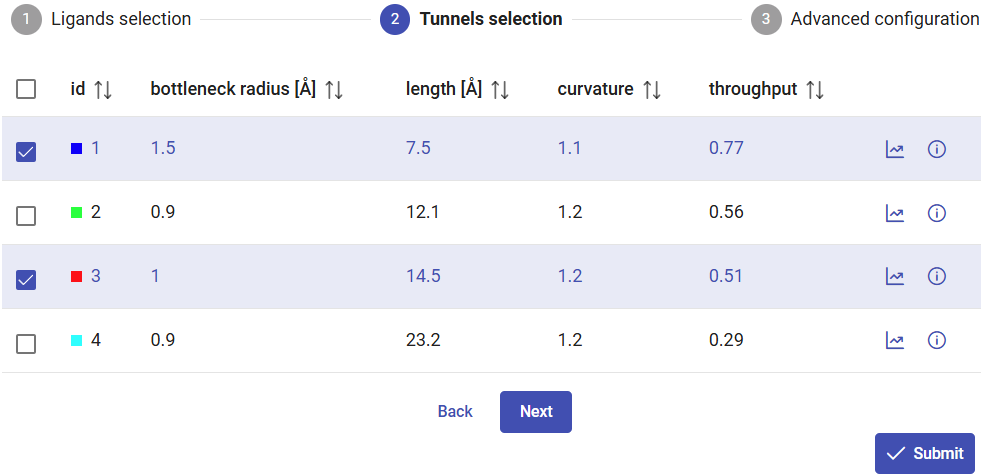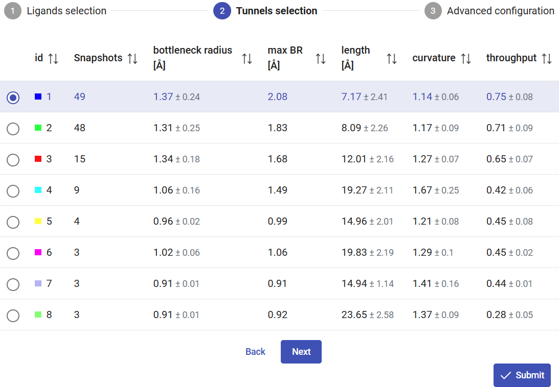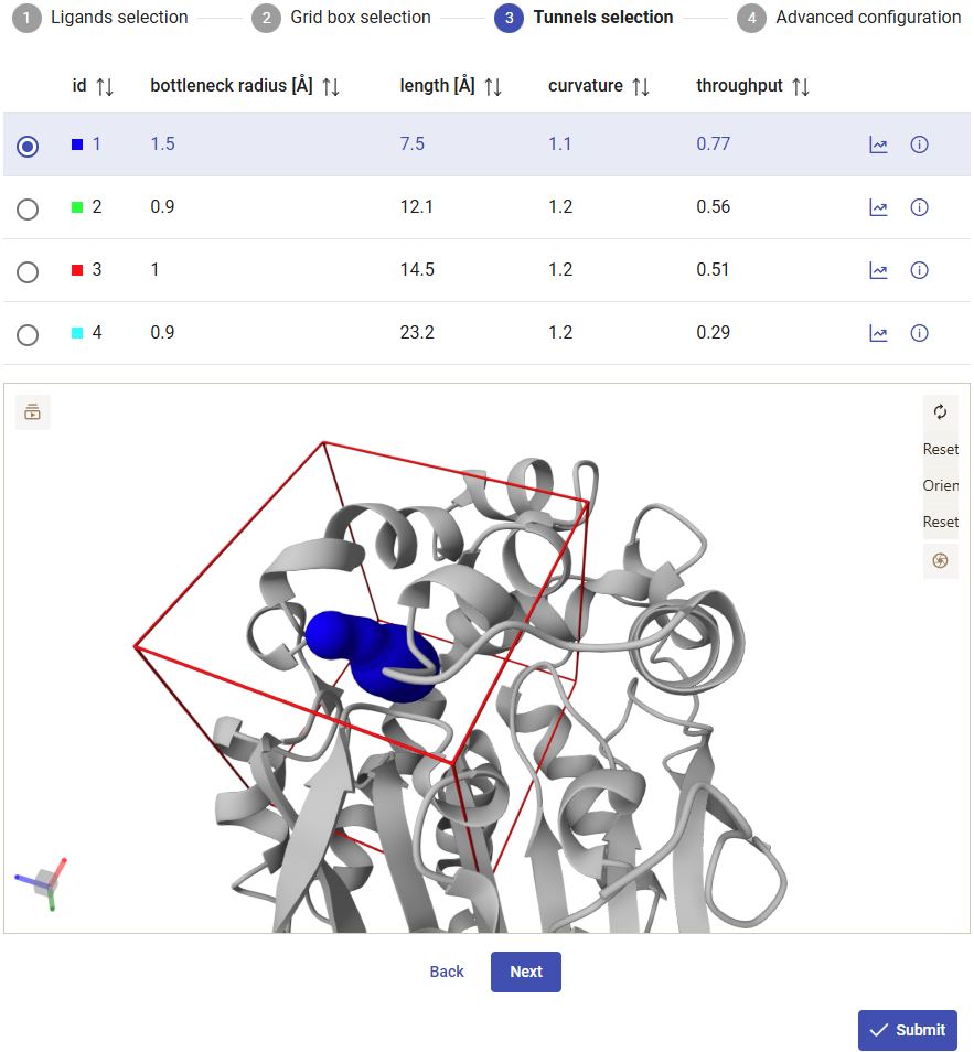 In Use Case 1, section 2, we found that tunnel 1 was the most likely used for transport of both substrate and product. Because CaverDock calculations need reasonable computational resources, in dynamic mode you can select only one tunnel in each submission. Therefore, select tunnel 1 for the current calculations, and click on “Next”.