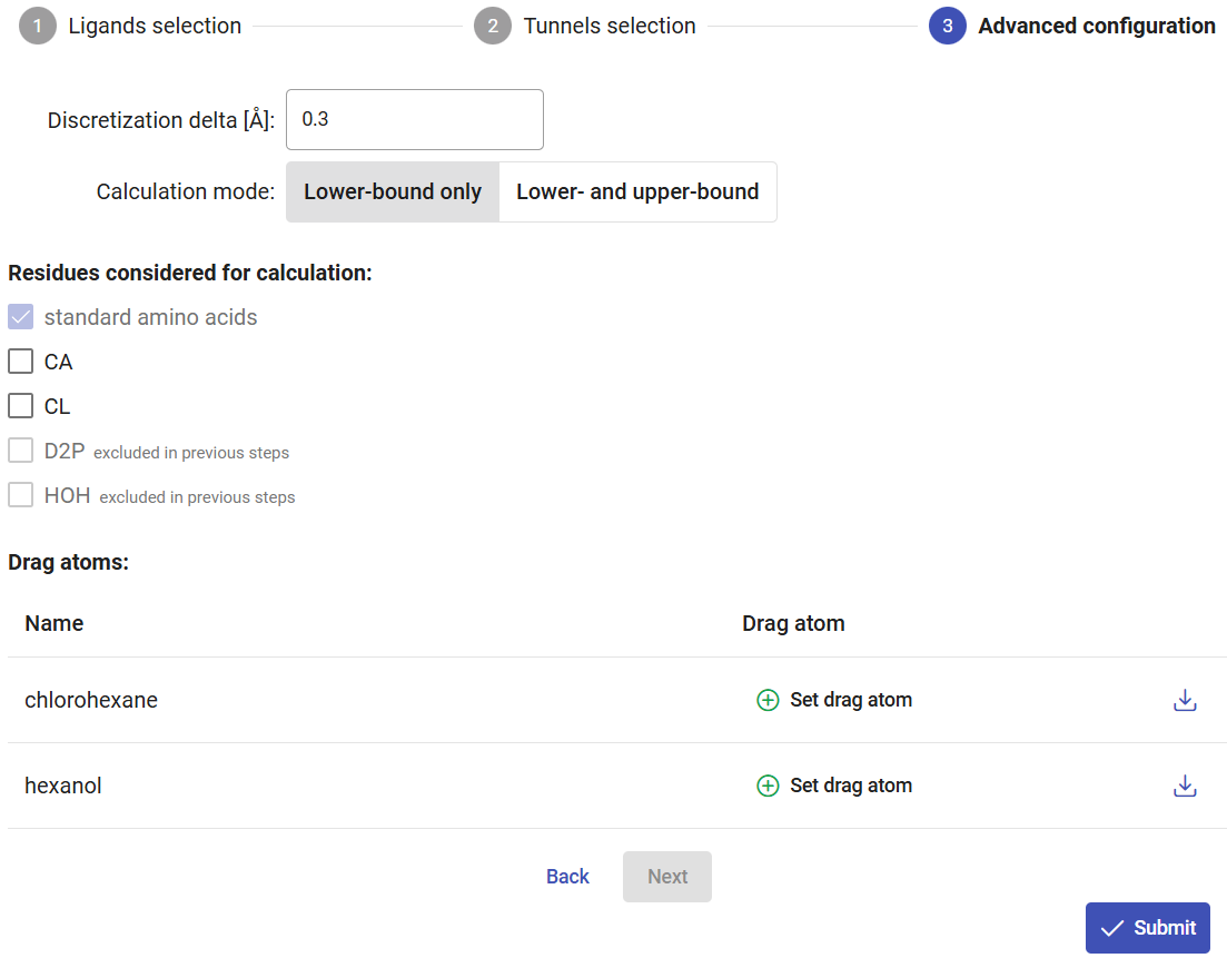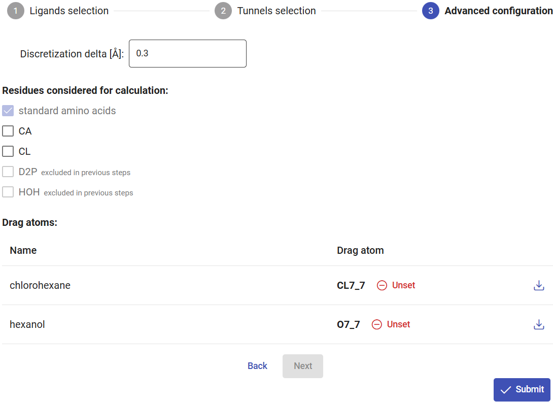 Click on “Next” for advanced configurations, or on “Submit” to proceed immediately with the CaverDock calculations.