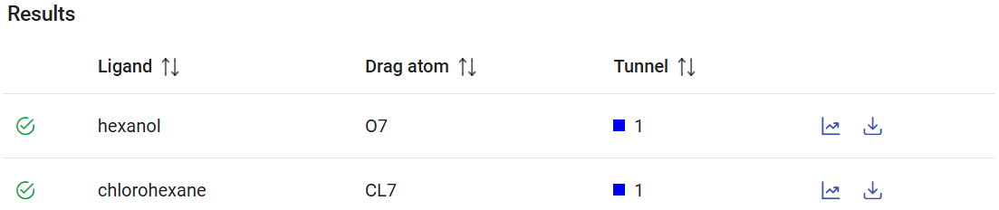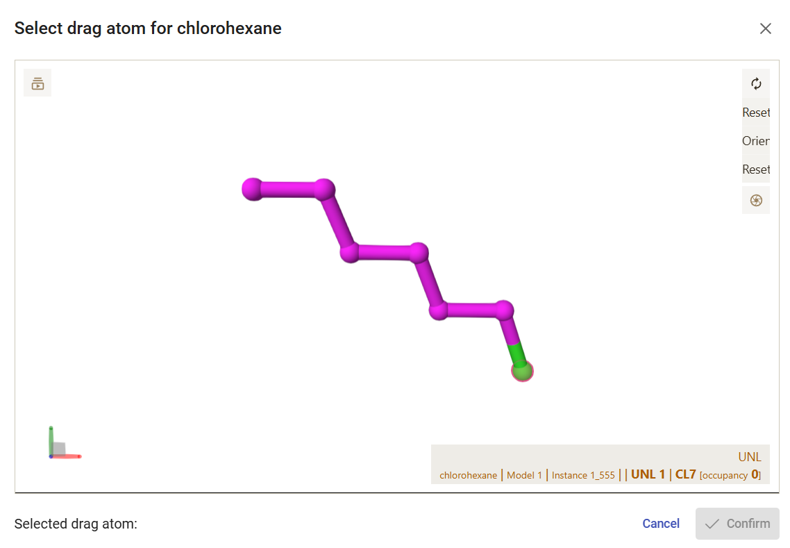If you click on the rightmost button available for each ligand, you can view and download the pdbqt file generated for that ligand. You can also specify an atom to be “dragged” along the tunnel, instead of the default center of mass of the ligand. For that, click on the “Set drag atom” button. For 1-chlorohexane, select the chlorine atom (CL7_7) and click on “Confirm”. For hexanol, select the hydroxyl oxygen atom (O7_7) and click on “Confirm”.