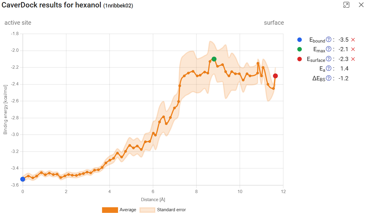 Click on “show results” for the calculation with hexanol in tunnel 1. You will find the CaverDock energy profile for the ligand traveling from the active site to the surface. In this dynamic mode, the profiles are accompanied by the respective standard error, which take into account the CaverDock profiles calculated for all the snapshots in the MD simulation. This profile can be compared with the profile obtained from the static structure for the same hexanol ligand in the same tunnel 1 (see Use Case 1, section 2; job pxtxpx), and we can conclude that there are significant differences. First of all, now we can assign a confidence interval to the binding energy at each point. We can also observe that the energy maximum became smoother. This is due to the natural fluctuations within the protein, including its tunnels and bottlenecks, and therefore also on the interactions that those residues can form with the ligand. The tunnels also seem longer than they were for a single structure. This is simply because the changes in the protein in some snapshots narrowed down the tunnel mouth, and as a consequence the overall length of the tunnel was extended.