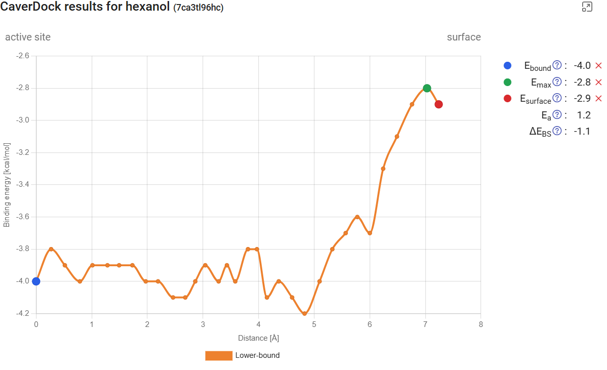 ), it will display the CaverDock energy profiles, which shows the change in the binding energy of the ligand moving along the tunnel out of the active site to the surface. Therefore, the “surface” will be at the left of the graph (Distance 0) and the “active site” at the right. For a more detailed explanation, see Use Case 1, section 2.