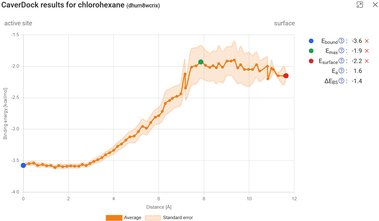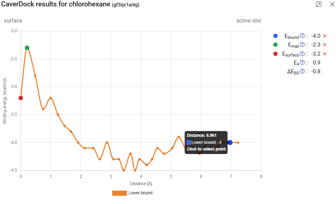 ), it will display the CaverDock energy profiles, which shows the change in the binding energy of the ligand moving along the tunnel. If the user-defined direction was “in”, the “surface” will be at the left of the graph (Distance 0) and the “active site” at the right. The opposite will happen for the “out” direction. Click on “show results” for the calculation with chlorohexane in tunnel 1 and the “in” direction. The energy at the surface (at the left) we call Esurf. Soon after the surface, the energy increased to its maximum value during the trajectory, which we call Emax. At the left-most part of the plot we have the energies at the active site, with energies that we call Ebound. If you hover your mouse over each point, you will see the details for that point. If you click one point, you can add one of the tags: Ebound, Emax, or Esurf. The respective energies will appear listed on the upper-right corner, together with two new values: the activation energy Ea (Ea = Emax – Esurf for the “in” direction, and Ea = Emax – Ebound), and the energy difference between the bound state and the surface ΔEBS (ΔEBS = Ebound – Esurf). These values provide important inform about the kinetics (the lower the Ea, the faster the process) and thermodynamics (the more negative the ΔEBS, the more prone is the ligand bind the active site instead of the surface) of the ligand binding process.
