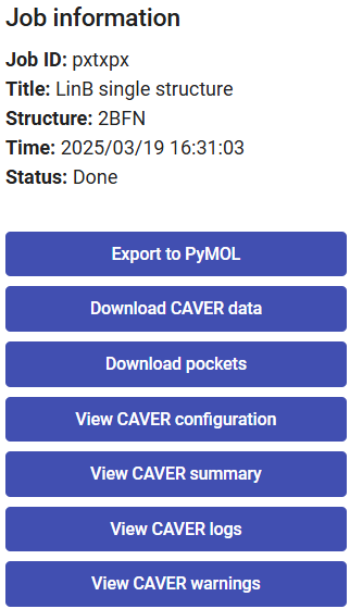 Below that, you can find several buttons, allowing you to download the visualization into a PyMOL session, the complete CAVER data folder as a zip file, the pockets calculated with the software fpocket, the CAVER configuration file, CAVER summary file, and several intermediate log files.
