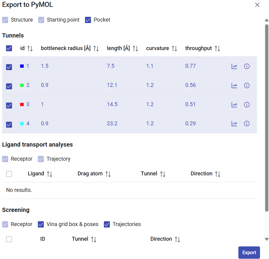 When you click on “Export to PyMOL”, select which objects you want to download, such as the pocket and tunnels, and click on “Export”. A zip file will be downloaded, then extract it to a regular folder and load the pymol.pml file into PyMOL. All the elements selected for download will be loaded in PyMOL and represented in a nice visualization that can be saved as a session for detailed inspection or even exported as an image for publication.