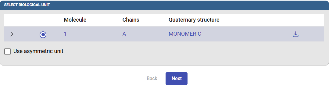 After this, the biological unit will be displayed according to the information contained in the PDB file. If you prefer to use the asymmetric unit instead, check this box. Click on “Next” to select the starting point for the tunnel calculation.
