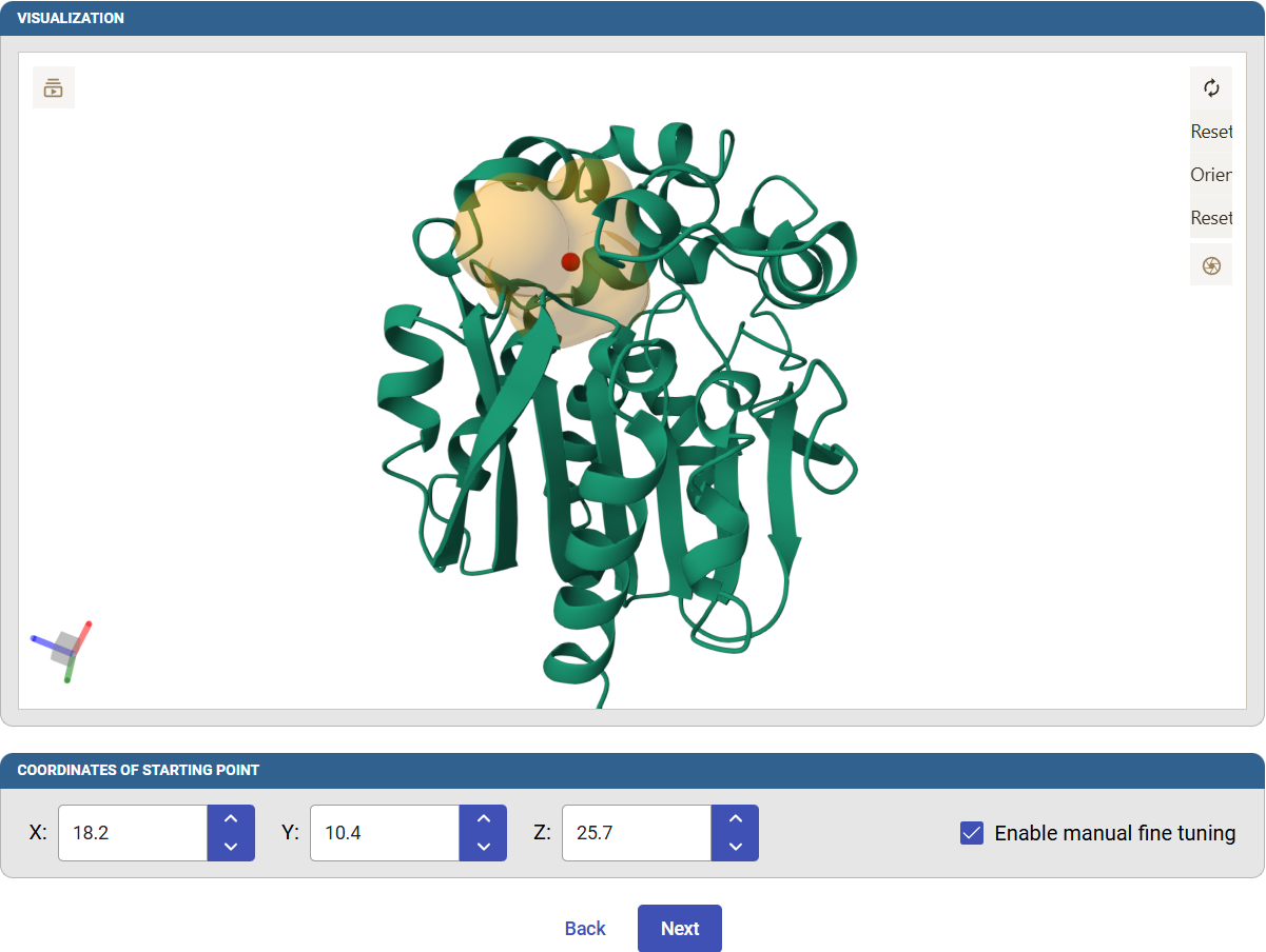 You can check the “Enable manual fine tuning” and manually change the Cartesian coordinates of the starting point. Click on “Next” to define the remaining Caver parameters for the tunnel calculation.