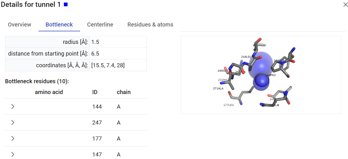 ) will display all the details about the tunnel, like the bottleneck location and residues, the centerline, and the tunnel-lining residues and atoms.