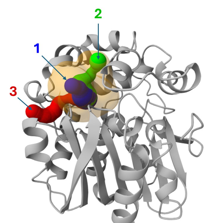 Among the tunnels obtained for LinB (previous section), since tunnels 1 and 2 are superimposed for a good part of their topology (see the image below), we will investigate tunnels 1 and 3 to perform a comparative study.