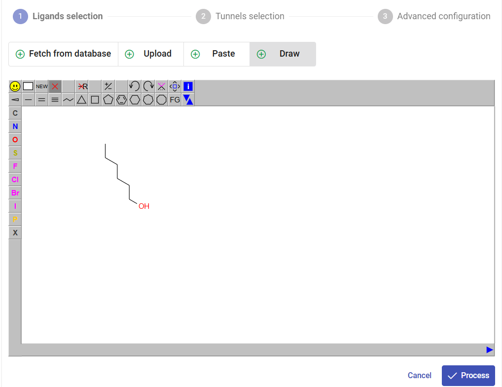 You can also add another ligand to the list for a single submission. For the sake of this example, click on the “Draw” pane, and draw the 2D formula of 1-hexanol as in the figure below, and click on “Process”. Under the field “Name”, change the name from CCCCCCO to “hexanol”.