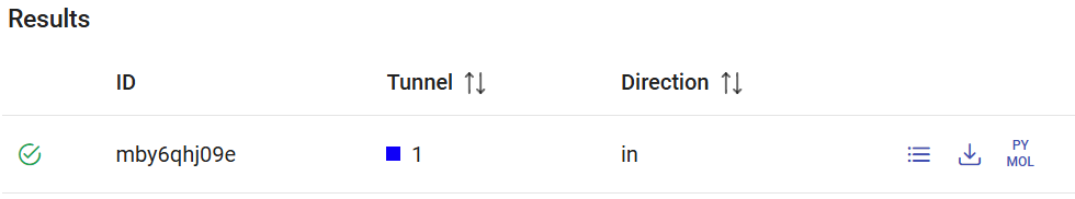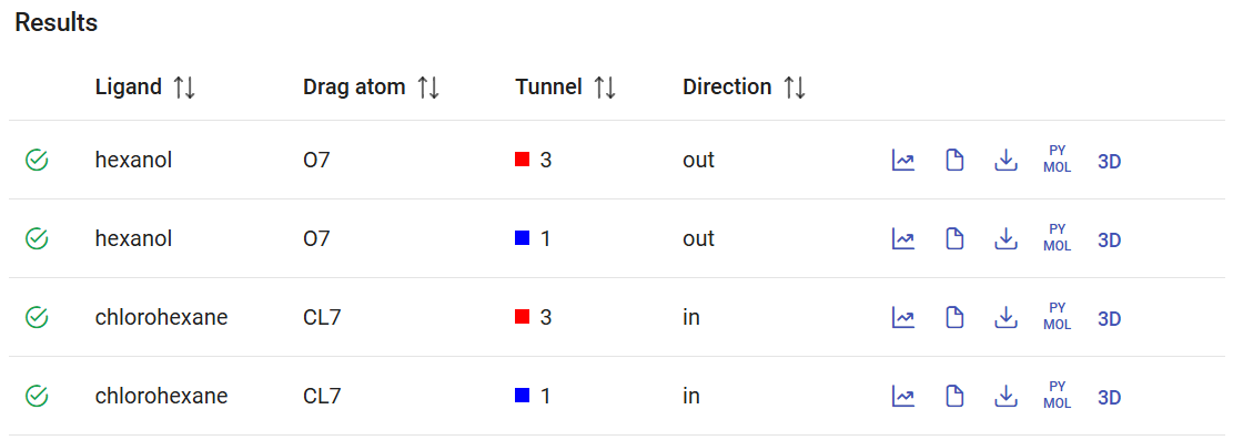 After the screening jobs have finished, they can be found in the Results panel (which lists all the screening jobs) with a green check mark on the left if they finished successfully. Each job has an ID, the selected tunnel for the CaverDock calculation, and the respective direction (“in” is the only direction currently allowed).