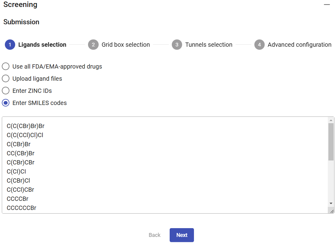 For this example, select the option “Enter SMILES codes”, copy and paste the list of SMILES codes below, which describe several halogenated compounds (as obtained from PubChem) that are potential substrates for the haloalkane dehalogenases, and then click on “Next”.