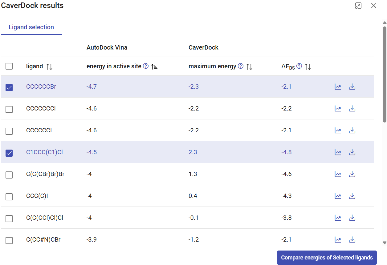 The screening job mby6qhj09e corresponds to the previous calculation with the list of substrates. Click on the respective “Show results” button. You will see a window displaying the list of ligands with best binding energies in the binding site. For each compound, you can see the binding energy at the active site (from docking with AutoDock Vina), and parameters from the CaverDock profile: the maximum energy and the energy difference between the bound state and the surface (ΔEBS). On the right-most side, you find icons that allow you to visualize the CaverDock profiles (