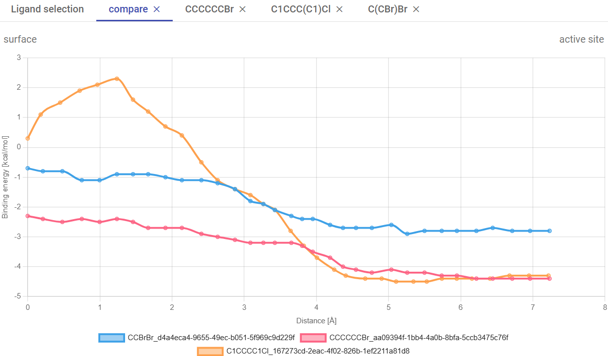 A new tab will open, with the CaverDock profiles superimposed for the three selected compounds. You can see that substrate CCCCCCBr (1-bromohexane) showed the best affinity in the active site (-4.7 kcal/mol). C1CCC(C1)Cl (chlorocyclopentane) showed the most favorable ΔEBS difference (-4.8 kcal/mol) but a higher energy barrier (Ea 2.5 kcal/mol), which suggests hindrance on its transport due to its bulkiness. The fact that all these compounds have negative binding energies in the active site (with affinities ranging between -4.7 to -2.9 kcal/mol) and relatively low Ea suggests that most of them can have favorable thermodynamics for binding haloalkane dehalogenase LinB, and hence they may be potential substrates for this enzyme. We already know this to be true, from the literature (2). Experimentally validated LinB favorite substrate, 1,2-dibromoethane (C(CBr)Br) is among them with the active site affinity -2.9, Ea 0.0, ΔEBS -2.9 kcal/mol. The fact that it did not show the absolute best values among all the substrates suggests that, although the access of this substrate through the tunnels is favorable, it is not the main determinant for the catalytic conversion of this substrate. In the window, you can have multiple tabs with the individual CaverDock profiles and with the comparison of selected ligands.