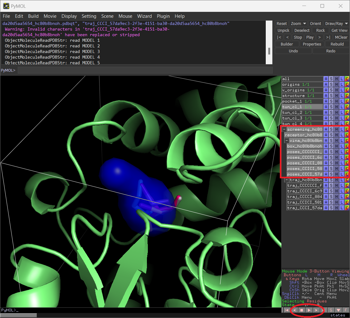 Under “screening”, you can find the docking and CaverDock results. Now display the object “receptor” to represent the protein. If you display the objects under “vina”, you will see the grid box (used in the docking) and the docking “poses” for the different ligands, which you can analyze individually in detail and investigate all the existing interactions and contacts. By default, you will see the best-ranked binding modes, but if you click on the “next” or “previous” buttons you can visualize alternative poses from AutoDock Vina (ordered by the energy scores, from best to worse).